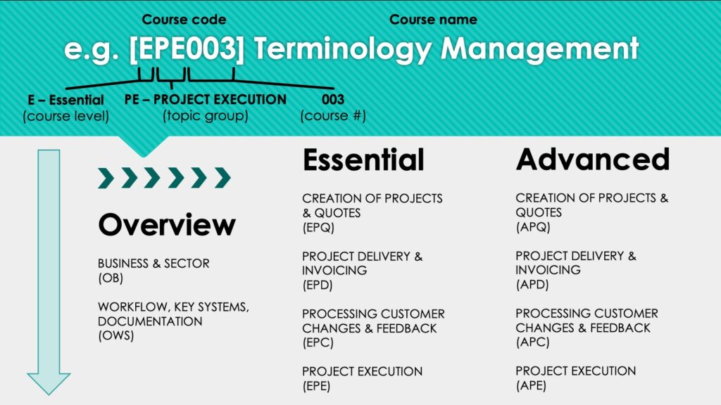 The Learning Center’s courses have been categorised into different levels & topic groups. Refer to the following diagram to understand the learning sequence & the course code for each topic group.